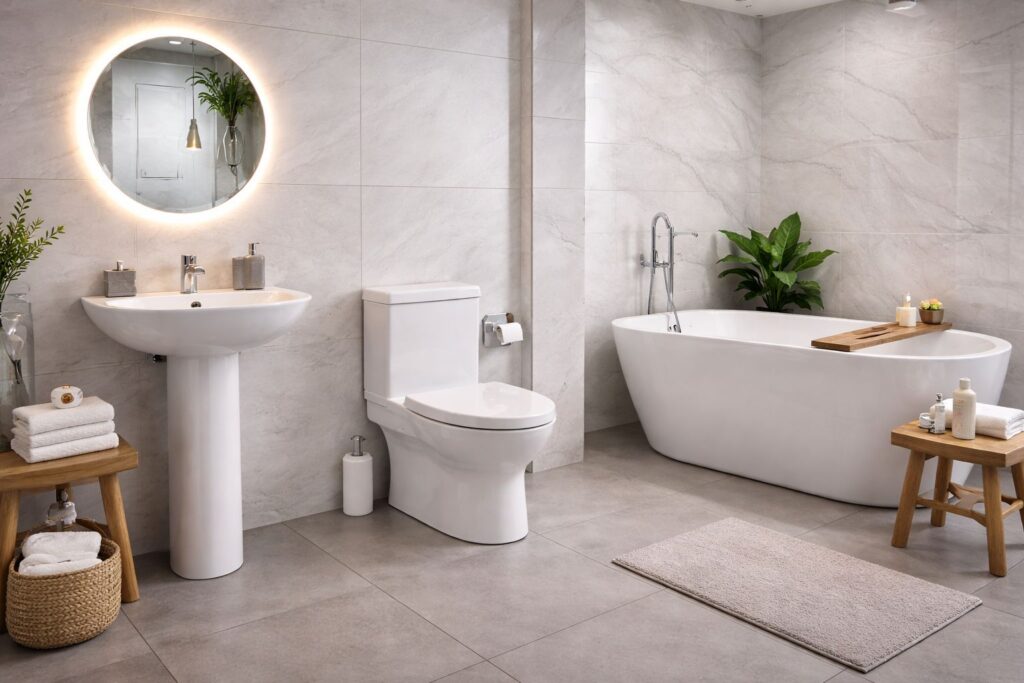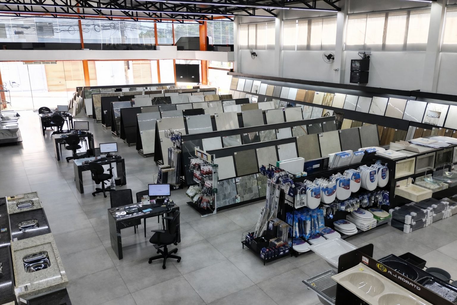 Encontre em um só lugar materiais de construção, pisos, porcelanatos, revestimentos e uma linha completa para banheiro e cozinha. Trabalhamos com produtos de qualidade para todas as etapas da sua obra — da fundação ao acabamento final — garantindo praticidade, economia e excelente custo-benefício.